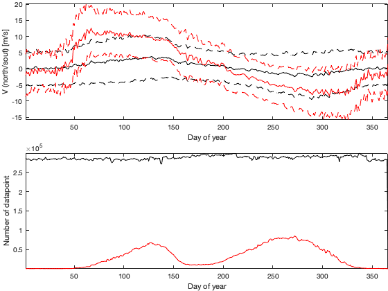 if plotit A=splitapply(@(x) mean(x,'all','omitnan'),vi.v,g.time_doy); B=splitapply(@(x) std(x,[],'all','omitnan'),vi.v,g.time_doy); C=splitapply(@(x) sum(~isnan(x(:))),vi.v,g.time_doy); A0=splitapply(@(x) mean(x,'all','omitnan'),vi0.v,g.time_doy); B0=splitapply(@(x) std(x,[],'all','omitnan'),vi0.v,g.time_doy); C0=splitapply(@(x) sum(~isnan(x(:))),vi0.v,g.time_doy); figure; tiledlayout('flow','TileSpacing','tight','Padding','tight') nexttile; hold on; plot(A0,'-k'); plot(A0+B0,'--k'); plot(A0-B0,'--k'); plot(A,'-r'); plot(A+B,'--r'); plot(A-B,'--r'); ylim([-15 15]); ylabel('V (north/sout) [m/s]'); xlabel('Day of year'); axis tight; nexttile; hold on; plot(C0,'k'); plot(C,'r'); xlabel('Day of year'); ylabel('Number of datapoint'); axis tight; figure('position',[0 0 900 600]); tiledlayout(2,2,'TileSpacing','tight','Padding','tight') nexttile; histogram((vi.v(:))); legend('v (North/South)'); axis tight; nexttile; histogram(vi.u(:)); legend('u (East/West)'); axis tight; nexttile; histogram((via(:))); legend('angle'); axis tight; nexttile; histogram(vin(:)); legend('norm'); axis tight; % Relationship density speed vin0 = abs(vi0.u + vi0.v*1i); figure('position',[0 0 900 600]); tiledlayout('flow','TileSpacing','tight','Padding','tight') for i_m=1:12 id=month(g.time)==i_m; nexttile; id2= id & vidTS<20; plot(vin0(id2),vidTS(id2),'.k'); hold on; plot(vin(id2),vidTS(id2),'.r') l=lsline; l(1).Color='k'; l(1).Color='r'; yline(trans.thr_T,'--r') end figure('position',[0 0 1900 900]); tiledlayout('flow','TileSpacing','tight','Padding','tight') for i_m=1:24 nexttile; if i_m<13 tmp = vi0; title(['old-' datestr(i_m*30,'mmm')]) else i_m=i_m-12; title(['new-' datestr(i_m*30,'mmm')]) tmp=vi; end tmp2=sqrt(tmp.u.^2+ tmp.v.^2); id=month(g.time)==i_m; borders('states','k'); scatter(radar.lon,radar.lat,70,nanmean(tmp2(id,:)),'o','filled','MarkerEdgeColor','k'); quiver(radar.lon,radar.lat,nanmean(tmp.u(id,:))',nanmean(tmp.v(id,:))','k') axis equal; axis([-125 -68 23 50]); set(gca,'ydir','normal'); xticks([]); yticks([]); caxis([0 15]) % title(num2str(sum(sum(tmp2(id,:)>0)))) end end