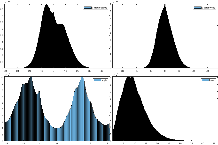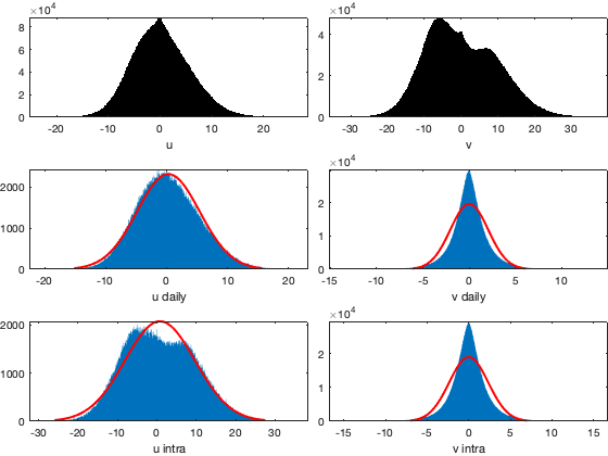 % Reproject the uv component % NOT USED: with 45° to not be aligned with the direction of migration. % vic.u = vin.*cos(via);%-deg2rad(45)); % vic.v = vin.*sin(via);%-deg2rad(45)); for i_uv=1:numel(uv) vicd.(uv{i_uv}) = splitapply(@(x) mean(x,'omitnan'),vi.(uv{i_uv}),g.day_id); vici.(uv{i_uv}) = vi.(uv{i_uv})-vicd.(uv{i_uv})(g.day_id,:); end figure; tiledlayout('flow','TileSpacing','tight','Padding','tight') nexttile; histogram(vi.(uv{1})); xlabel('u');axis tight; nexttile; histogram(vi.(uv{2})); xlabel('v');axis tight; nexttile; histfit(vicd.(uv{1})(:)); xlabel('u daily');axis tight; nexttile; histfit(vici.(uv{1})(:)); xlabel('v daily');axis tight; nexttile; histfit(vicd.(uv{2})(:)); xlabel('u intra');axis tight; nexttile; histfit(vici.(uv{2})(:)); xlabel('v intra');axis tight;