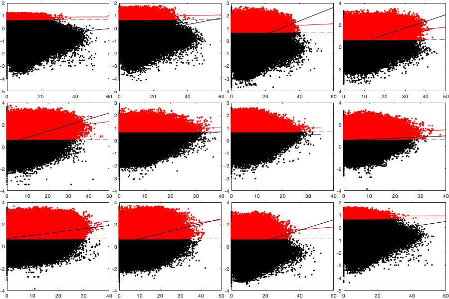 viuv_m=nan(2,366); viuv_s=nan(2,366); viuv_n=nan(1,366); for i_d=1:366 viuv_m(:,i_d) = [mean(vi.u(g.time_doy==i_d,:),'all','omitnan') mean(vi.v(g.time_doy==i_d,:),'all','omitnan')]; viuv_s(:,i_d) = [std(vi.u(g.time_doy==i_d,:),[],'all','omitnan') std(vi.v(g.time_doy==i_d,:),[],'all','omitnan')]; % GMModel{i_d} = fitgmdist([reshape(vi.u(g.time_doy==i_d,:),[],1) reshape(vi.v(g.time_doy==i_d,:),[],1)],1); viuv_n(i_d) = sum(~isnan(vi.u(g.time_doy==i_d,:)),'all'); end X=[viuv_m ; viuv_s]'; tmp=14; X_smooth = movmean([X(end-tmp:end,:) ; X ; X(1:tmp,:)],20); X_smooth = X_smooth((tmp+2):end-tmp,:); % compute the corresponding threashold per day of year and alpha alpha=.5; tval = tinv(alpha./viuv_n/2,repmat(viuv_n-2,1,numel(alpha))).^2; G = (viuv_n-1)./sqrt(viuv_n) .* sqrt(tval./(viuv_n-2+tval)); viunorm=(vi.u - X_smooth(g.time_doy,1)) ./ X_smooth(g.time_doy,3); vivnorm=(vi.v - X_smooth(g.time_doy,2)) ./ X_smooth(g.time_doy,4); tmp = sqrt( viunorm.^2 + vivnorm.^2 ); id_rm = tmp>G(g.time_doy)'; if plotit figure; tiledlayout('flow','TileSpacing','tight','Padding','tight') nexttile; plot(X_smooth(:,1),X_smooth(:,2),'-k'); axis equal nexttile; plot(X_smooth(:,3:4)); axis tight; figure; tiledlayout('flow','TileSpacing','tight','Padding','tight') for i_m=1:12 nexttile; grid on id=month(g.time)==i_m; plot(vi.u(id,:),vi.v(id,:),'.','color',[.6 .6 .6]); hold on; plot(vi.u(id&~id_rm),vi.v(id&~id_rm),'.k'); xline(0,'r'); yline(0,'r') % ksdensity([reshape(vi.u(id,:),[],1) reshape(vi.v(id,:),[],1)],'PlotFcn','contour') axis equal; axis([-40 40 -40 40]); title(datestr(i_m*30,'mmm')) end figure;tiledlayout('flow','TileSpacing','tight','Padding','tight') nexttile; histfit(vi.v(:)); axis tight; nexttile; histfit(reshape(vi.v(~id_rm),1,[])); axis tight; end vi.u(id_rm)=nan; vi.v(id_rm)=nan;