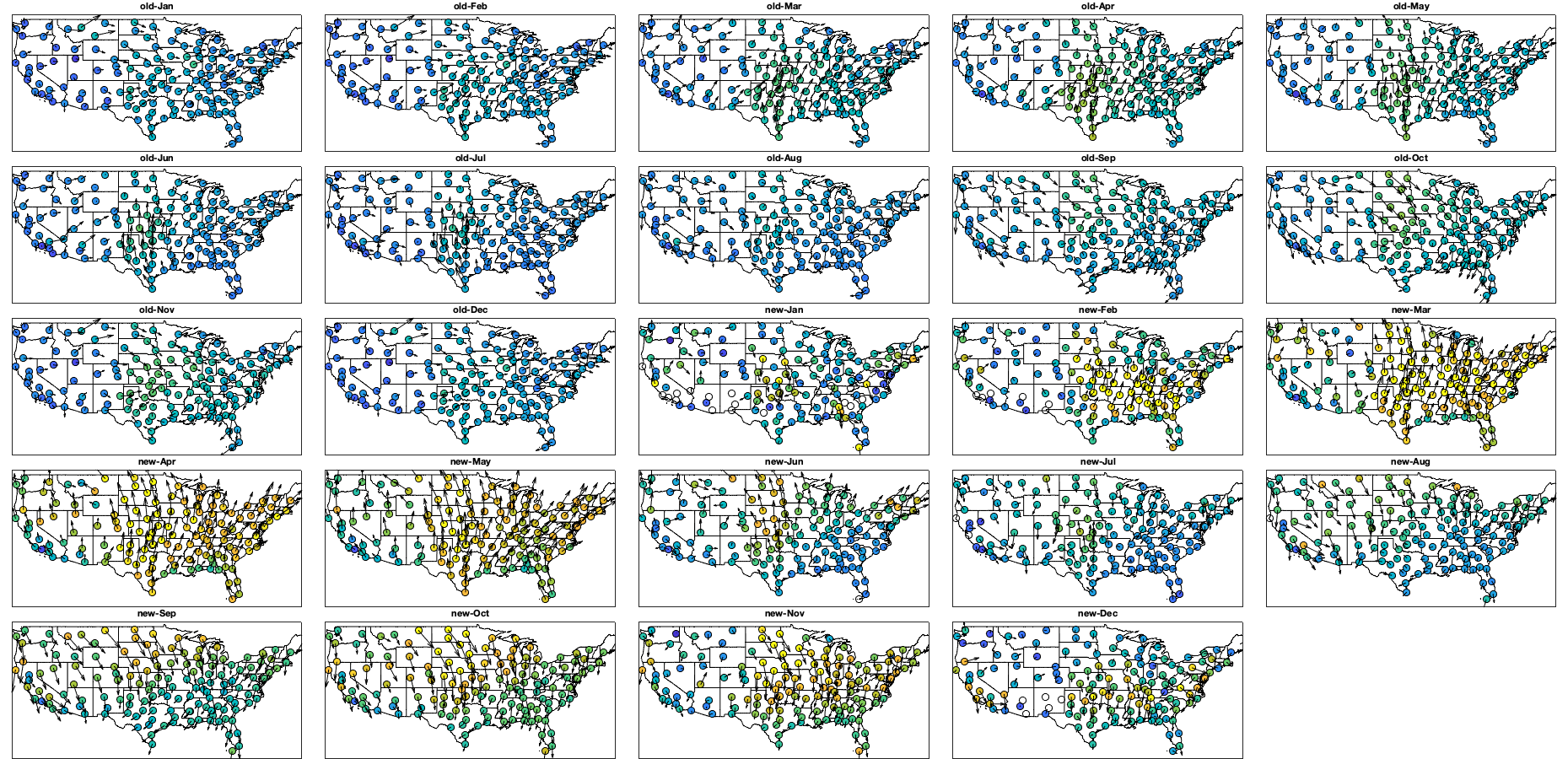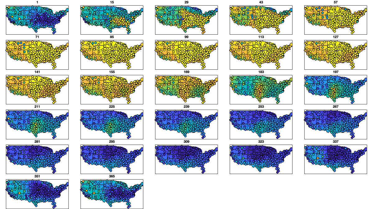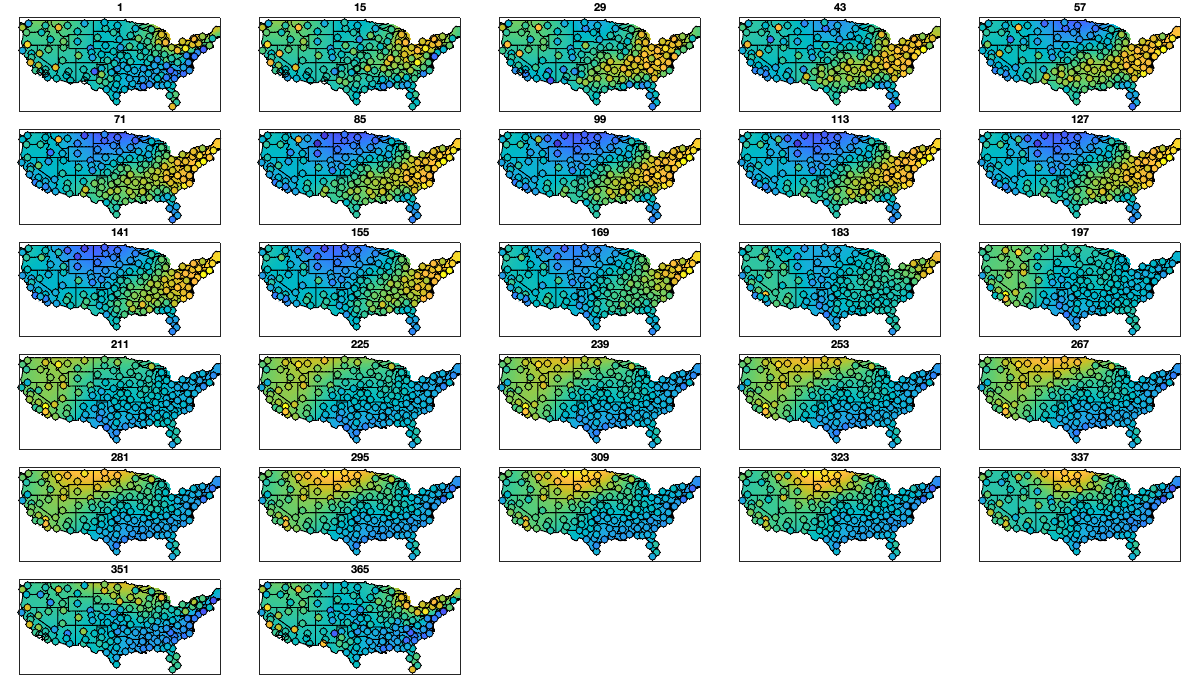 ddoy_g = 14; doy_g=1:ddoy_g:366; for i_uv=1:numel(uv) % Initialize variable victd_mean_doy_radar.(uv{i_uv})=nan(numel(doy_g),height(radar)); victd_trend.(['sf_mean_' uv{i_uv}]) = cell(numel(doy_g),1); for i_doy = 1:numel(doy_g) % select a windows of 2* ddoy_g accounting for cyclical year id = abs(mod(g.day_doy+180-doy_g(i_doy),366)-180)<(ddoy_g*3); % compute the average and std per period and radar victd_mean_doy_radar.(uv{i_uv})(i_doy,:) = mean(vicd.(uv{i_uv})(id,:),'omitnan'); w = sum(~isnan(vicd.(uv{i_uv})(id,:))); % Fit a lowess function id=~isnan(victd_mean_doy_radar.(uv{i_uv})(i_doy,:)); victd_trend.(['sf_mean_' uv{i_uv}]){i_doy} = fit([radar.lon(id),radar.lat(id)],victd_mean_doy_radar.(uv{i_uv})(i_doy,id)' ,'lowess','weights',w(id)); end end % Visualize the fit if plotit for i_uv=1:2 figure('position',[0 0 1200 675]); tiledlayout('flow','TileSpacing','tight','Padding','tight') for i_doy = 1:numel(doy_g) nexttile; tmp = reshape(victd_trend.(['sf_mean_' uv{i_uv}]){i_doy}([g.LON(:) g.LAT(:)]),size(g.LAT)); tmp(g.mask_water)=nan; imagesc(g.lon,g.lat,tmp, alphadata=~isnan(tmp)) borders('states','k'); scatter(radar.lon,radar.lat,50,victd_mean_doy_radar.(uv{i_uv})(i_doy,:),'o','filled','MarkerEdgeColor','k'); caxis([-10 10]); axis equal; axis([-125 -68 23 50]); title(doy_g(i_doy)); set(gca,'ydir','normal'); xticks([]); yticks([]) end end end % Compute the residual for i_uv=1:numel(uv) % First, compute for each period-radar victd_mean_doy_radar_t.(uv{i_uv})=nan(numel(doy_g),height(radar)); for i_doy = 1:numel(doy_g) victd_mean_doy_radar_t.(uv{i_uv})(i_doy,:)=victd_trend.(['sf_mean_' uv{i_uv}]){i_doy}([radar.lon,radar.lat]); end % Then, interpolate the value in between victd1.(uv{i_uv})=nan(size(vicd.(uv{i_uv}))); for i_r=1:height(radar) victd1.(uv{i_uv})(:,i_r) = vicd.(uv{i_uv})(:,i_r)-interp1(doy_g,victd_mean_doy_radar_t.(uv{i_uv})(:,i_r), g.day_doy,'pchip'); end end % Check residual per month % i_uv=1; % figure('position',[0 0 1200 675]); % tiledlayout('flow','TileSpacing','tight','Padding','tight') % for i_m=1:12 % axes(ha(i_m)); hold on; title(datestr(datetime(1,i_m,1),'mmm')); % borders('states','k'); % scatter(radar.lon,radar.lat,200,nanmean(victd1.(uv{i_uv})(month(g.day)==i_m,:)),'o','filled') % axis equal; axis([-125 -68 23 50]); caxis([-1 1]) % end
