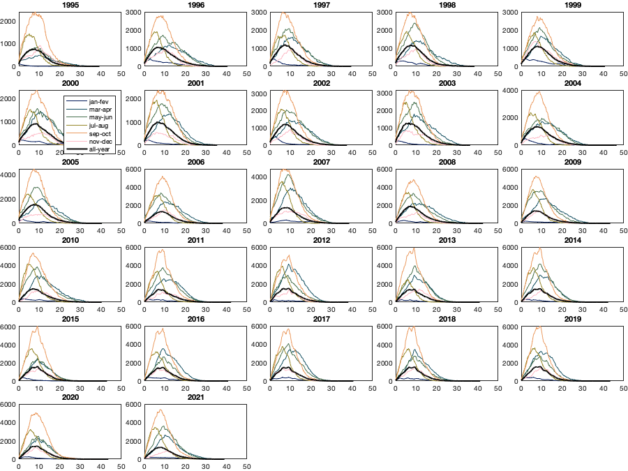 if plotit figure('position',[0 0 900 675]);tiledlayout('flow','TileSpacing','tight','Padding','tight') col = crameri('batlow',12); for i_y=1995:2021 nexttile; % histogram(vin(year(g.time)==i_y,:)) hold on; for i_m=1:2:11 [N,edges] = histcounts(vin(year(g.time)==i_y&(month(g.time)==i_m|month(g.time)==(i_m+1)),:)); plot(edges(1:end-1),N,'color',col(i_m,:)) end [N,edges] = histcounts(vin(year(g.time)==i_y,:)); plot(edges(1:end-1),N/6,'-k','linewidth',2) xlim([0 50]) title(i_y) if i_y==2000 legend({'jan-fev','mar-apr','may-jun','jul-aug','sep-oct','nov-dec','all-year'}) end end end