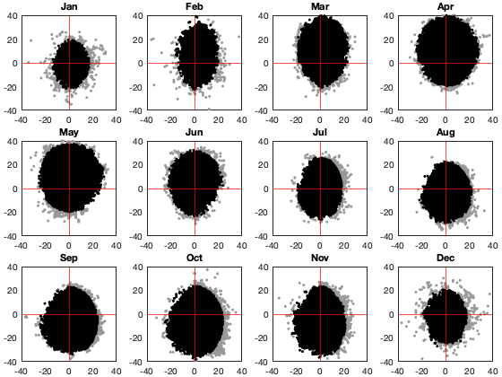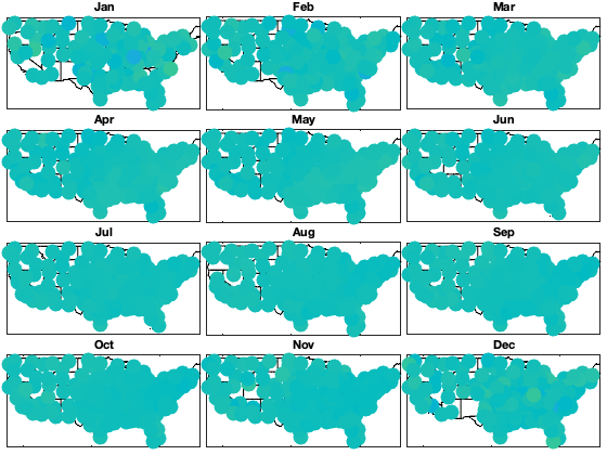 if plotit i_uv=1; figure; ha = tight_subplot(4,3,[.03 .01],[.01 .03],.01); for i_m=1:12 axes(ha(i_m)); hold on; title(datestr(datetime(1,i_m,1),'mmm')); borders('states','k'); scatter(radar.lon,radar.lat,200,nanmean(victi.(uv{i_uv})(month(g.time)==i_m,:)),'o','filled') axis equal; axis([-125 -68 23 50]); caxis([-1 1]) end end