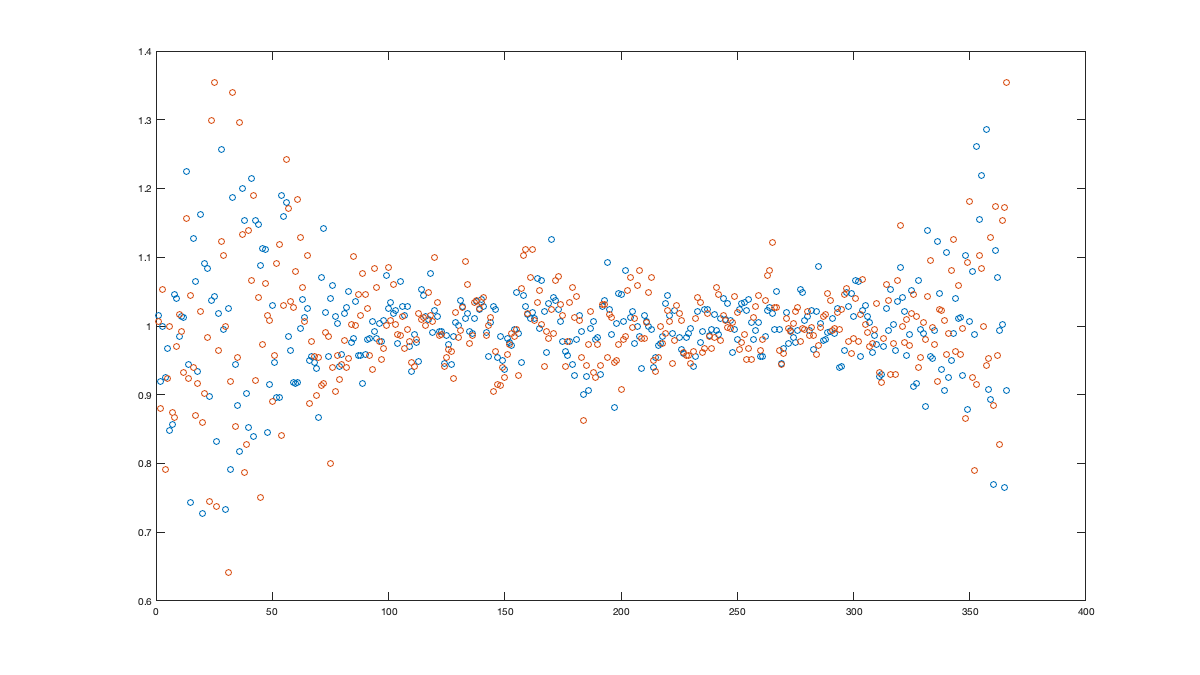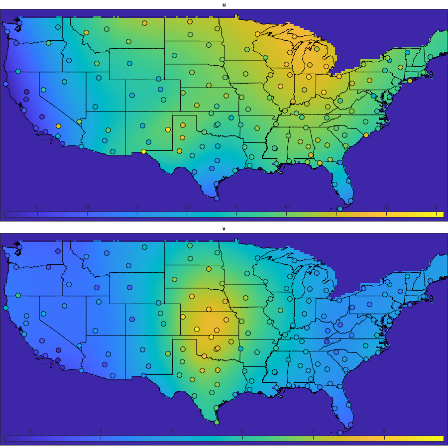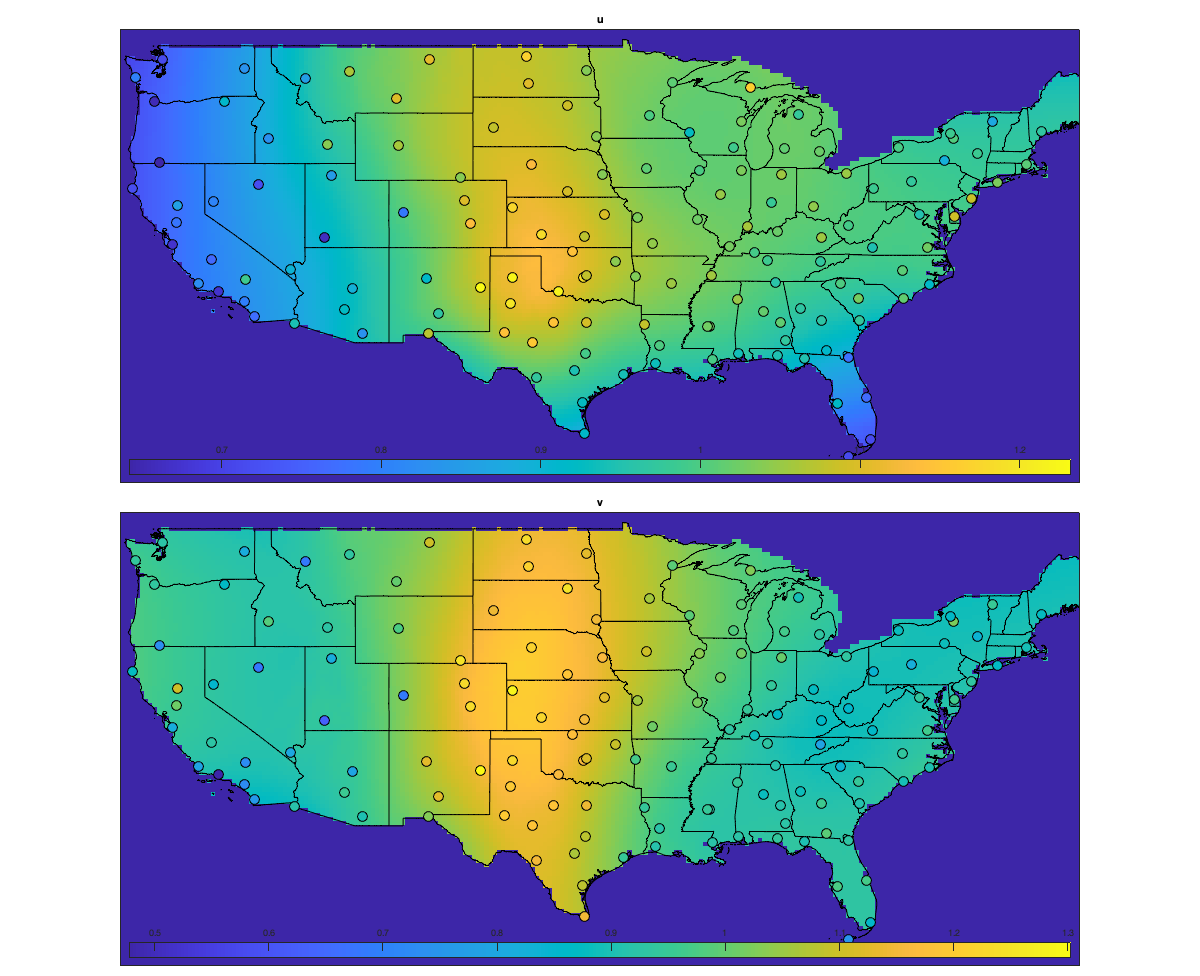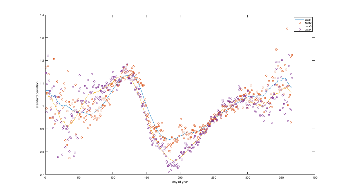 % Spatial for i_uv=1:numel(uv) w = sum(~isnan(victi.(uv{i_uv}))); victi_trend.(['sf_std_' uv{i_uv}]) = fit([radar.lon,radar.lat],std(victi.(uv{i_uv}),'omitnan')','lowess','weight',w); end % Visualize the fit if plotit figure('position',[0 0 1200 1200]); ha = tight_subplot(2,1,[.03 .01],[.01 .03],.01); for i_uv=1:numel(uv) axes(ha(i_uv)) tmp = reshape(victi_trend.(['sf_std_' uv{i_uv}])([g.LON(:) g.LAT(:)]),size(g.LAT)); tmp(g.mask_water)=nan; imagesc(g.lon,g.lat,tmp) borders('states','k'); scatter(radar.lon,radar.lat,100,std(victi.(uv{i_uv}),'omitnan'),'o','filled','MarkerEdgeColor','k'); colorbar('south'); axis equal; axis([-125 -68 23 50]); title(uv{i_uv}); set(gca,'ydir','normal'); xticks([]); yticks([]) end end % Compute the residual for i_uv=1:numel(uv) victi1.(uv{i_uv}) = victi.(uv{i_uv}) ./ victi_trend.(['sf_std_' uv{i_uv}])([radar.lon,radar.lat])'; end % Check residual if plotit figure('position',[0 0 675 675]); ha = tight_subplot(2,1,[.03 .01],[.01 .03],.01); for i_uv=1:numel(uv) axes(ha(i_uv)) borders('states','k'); scatter(radar.lon,radar.lat,100,std(victi1.(uv{i_uv}),'omitnan'),'o','filled','MarkerEdgeColor','k'); caxis([.8 1.2]); axis equal; axis([-125 -68 23 50]); title(uv{i_uv}); set(gca,'ydir','normal'); xticks([]); yticks([]); colorbar; end end % Temporal for i_uv=1:numel(uv) tmp = splitapply(@(x) std(x,[],'all','omitnan'),victi1.(uv{i_uv}),g.time_doy); tmp2 = movmean([tmp(end-50:end) ; tmp ; tmp(1:50)],30); victi_trend.(['t_std_' uv{i_uv}]) = tmp2(52:(end-50)); end % Illustration if plotit figure('position',[0 0 1200 675]); hold on; for i_uv=1:numel(uv) plot(victi_trend.(['t_std_' uv{i_uv}])); plot(splitapply(@(x) std(x,[],'all','omitnan'),victi1.(uv{i_uv}),g.time_doy),'o') end xlabel('day of year'); ylabel('standard deviation'); legend end % remove trend for i_uv=1:numel(uv) victi2.(uv{i_uv}) = victi1.(uv{i_uv}) ./ victi_trend.(['t_std_' uv{i_uv}])(g.time_doy); end % figure('position',[0 0 1200 675]); hold on; % for i_uv=1:numel(uv) % plot(splitapply(@(x) std(x,[],'all','omitnan'),victi2.(uv{i_uv}),g.time_doy),'o') % end