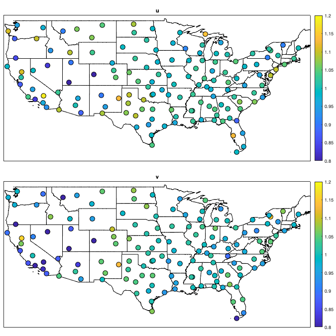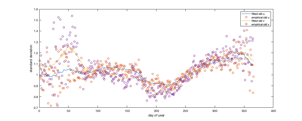 % Spatial for i_uv=1:numel(uv) w = sum(~isnan(victd1.(uv{i_uv}))); victd_trend.(['sf_std_' uv{i_uv}]) = fit([radar.lon,radar.lat],std(victd1.(uv{i_uv}),'omitnan')','lowess','weight',w); end % Visualize the fit if plotit figure('position',[0 0 900 900]); tiledlayout('flow','TileSpacing','tight','Padding','tight') for i_uv=1:numel(uv) nexttile; tmp = reshape(victd_trend.(['sf_std_' uv{i_uv}])([g.LON(:) g.LAT(:)]),size(g.LAT)); tmp(g.mask_water)=nan; imagesc(g.lon,g.lat,tmp) borders('states','k'); scatter(radar.lon,radar.lat,100,std(victd1.(uv{i_uv}),'omitnan'),'o','filled','MarkerEdgeColor','k'); axis equal; axis([-125 -68 23 50]); title(uv{i_uv}); set(gca,'ydir','normal'); xticks([]); yticks([]) colorbar('south'); %caxis([2 10]); end end % Compute the residual for i_uv=1:numel(uv) victd2.(uv{i_uv}) = victd1.(uv{i_uv}) ./ victd_trend.(['sf_std_' uv{i_uv}])([radar.lon,radar.lat])'; end % Check residual % figure('position',[0 0 675 675]); % tiledlayout('flow','TileSpacing','tight','Padding','tight') % for i_uv=1:numel(uv) % nexttile % borders('states','k'); % scatter(radar.lon,radar.lat,100,std(victd2.(uv{i_uv}),'omitnan'),'o','filled','MarkerEdgeColor','k'); % caxis([0 2]); axis equal; axis([-125 -68 23 50]); title(uv{i_uv}); set(gca,'ydir','normal'); xticks([]); yticks([]) % end % Temporal for i_uv=1:numel(uv) tmp = splitapply(@(x) std(x,[],'all','omitnan'),victd2.(uv{i_uv}),g.day_doy); tmp2 = movmean([tmp(end-50:end) ; tmp ; tmp(1:50)],30); victd_trend.(['t_std_' uv{i_uv}]) = tmp2(52:(end-50)); end % Illustration if plotit figure('position',[0 0 1000 400]); hold on; for i_uv=1:numel(uv) plot(victd_trend.(['t_std_' uv{i_uv}])); plot(splitapply(@(x) std(x,[],'all','omitnan'),victd2.(uv{i_uv}),g.day_doy),'o') end xlabel('day of year'); ylabel('standard deviation'); legend({'fitted std u','empirical std u', 'fitted std v','empirical std v'}) end % remove trend for i_uv=1:numel(uv) victd3.(uv{i_uv}) = victd2.(uv{i_uv}) ./ victd_trend.(['t_std_' uv{i_uv}])(g.day_doy); end if plotit figure('position',[0 0 1200 675]); hold on; for i_uv=1:numel(uv) plot(splitapply(@(x) std(x,[],'all','omitnan'),victd3.(uv{i_uv}),g.day_doy),'o') end end