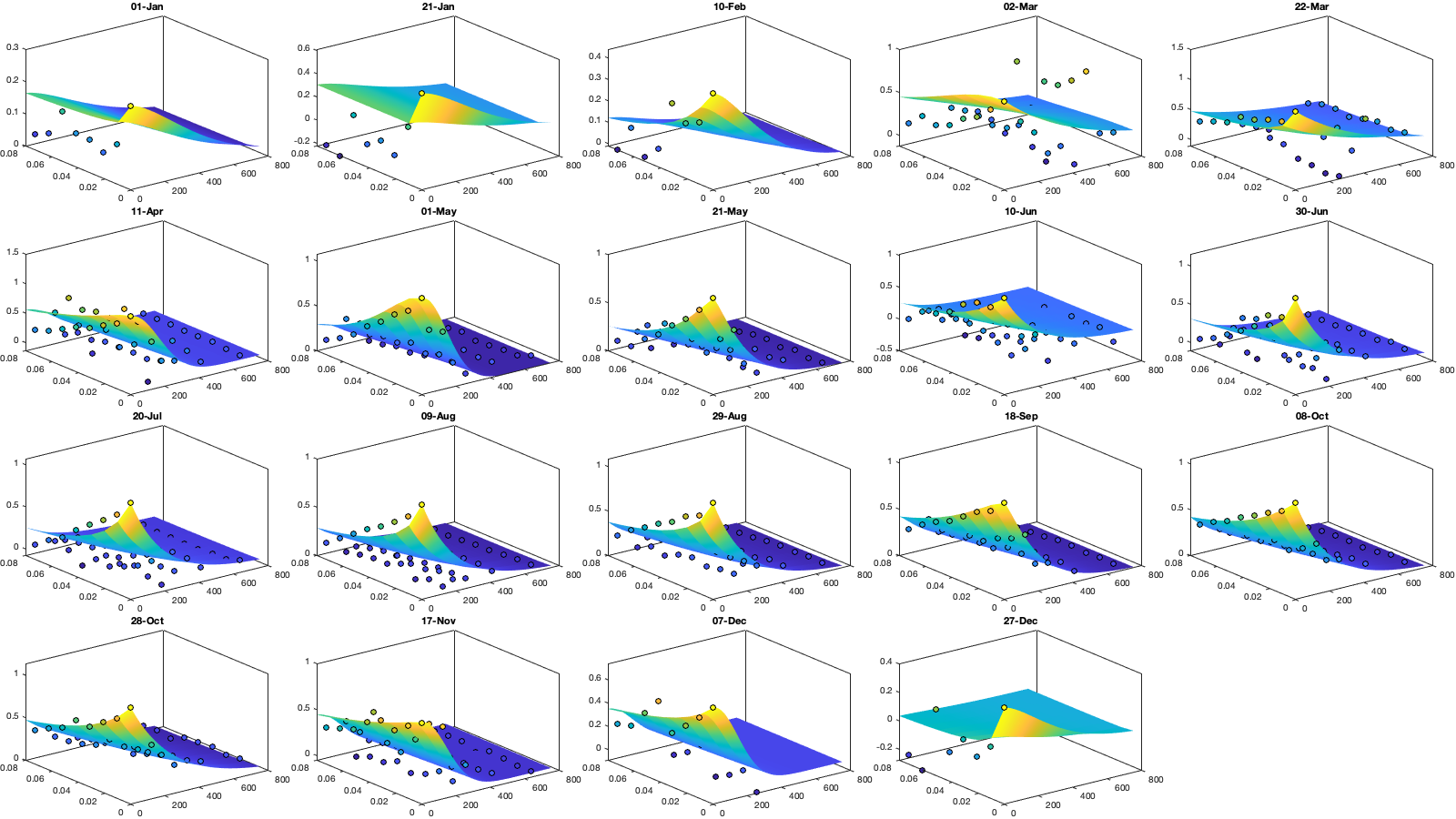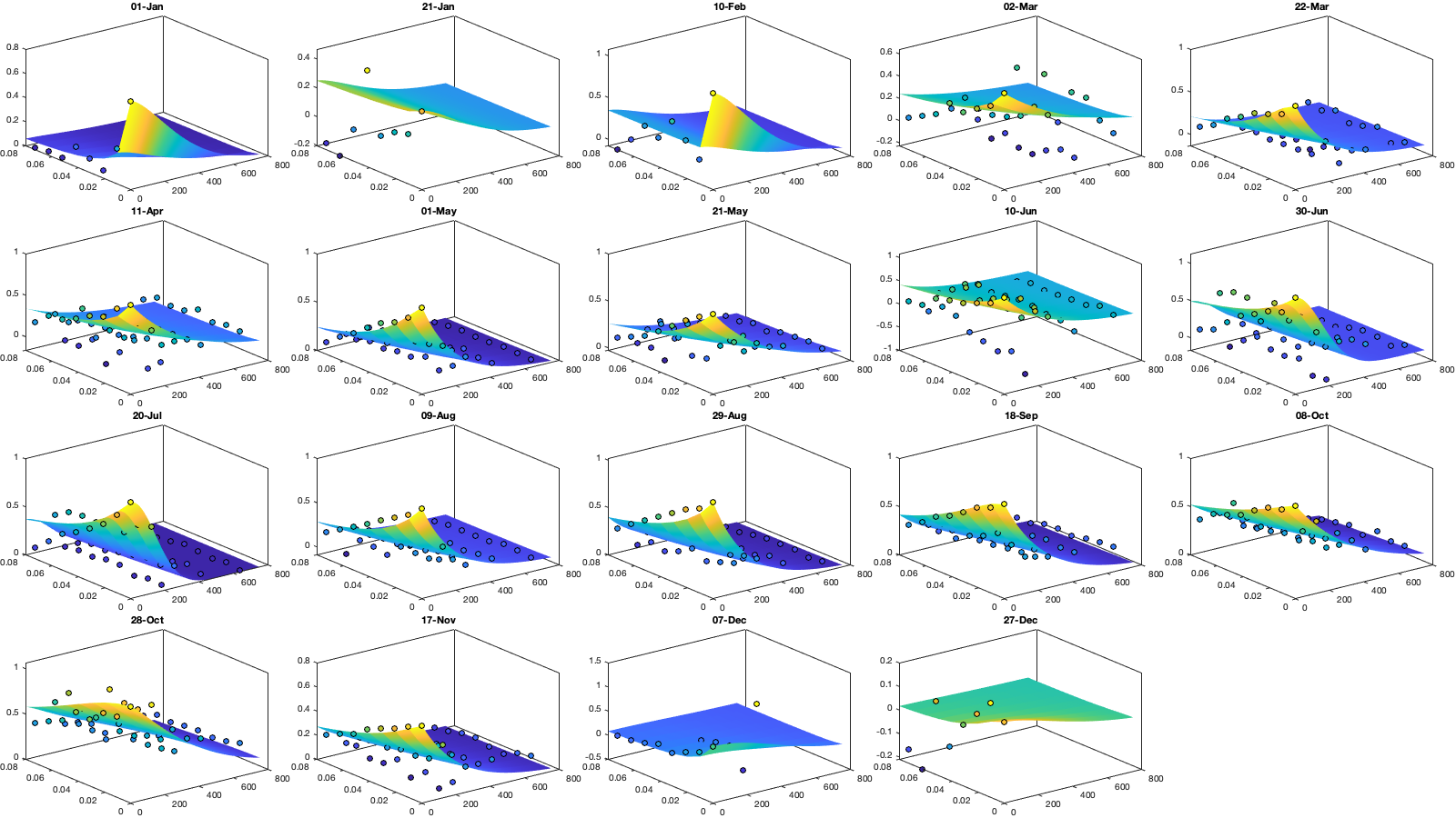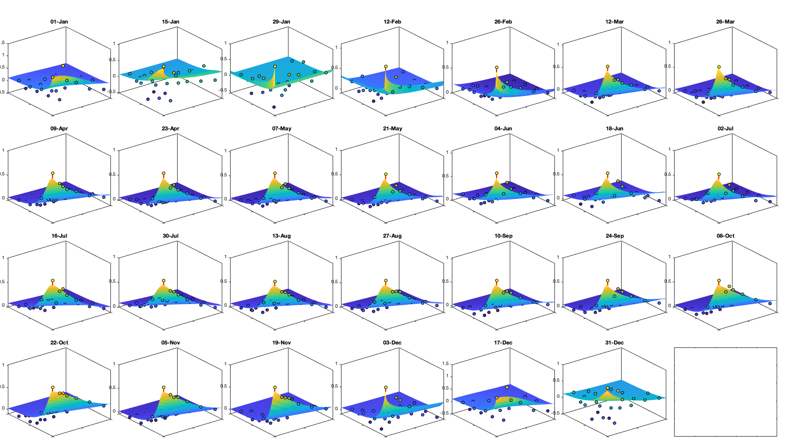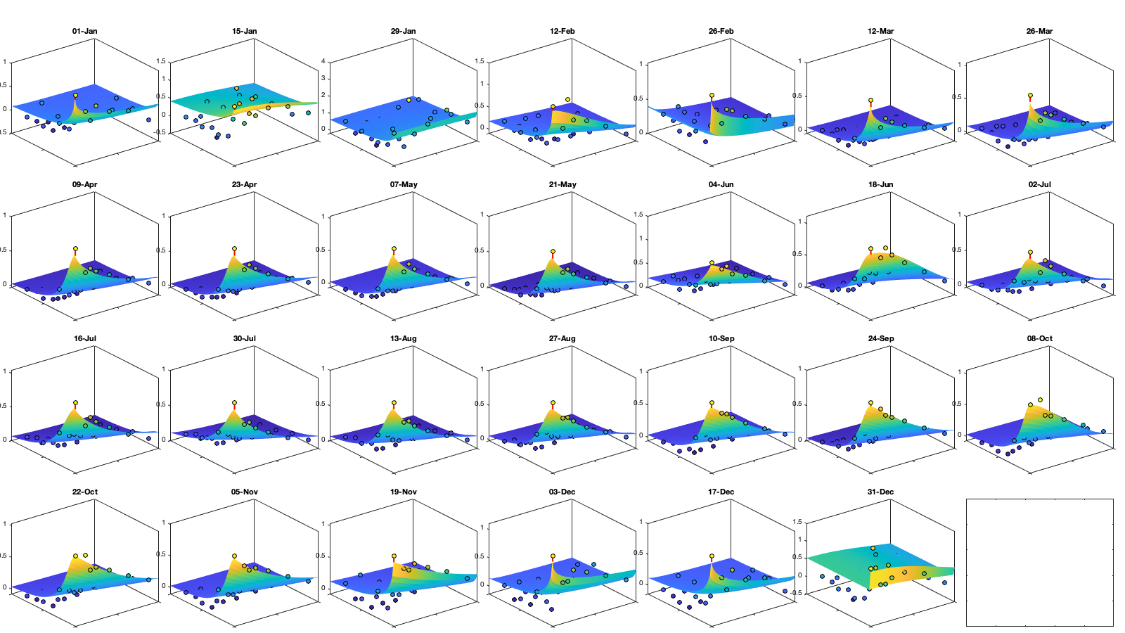 i_uv=1; figure('position',[0 0 1000 400]); ha = tight_subplot(6,5,[.03 .01],[.01 .06],.01); for i_m=1:numel(icov.m) axes(ha(i_m)); surf(icov.D_emp(:,:,i_m),icov.T_emp(:,:,i_m),icov.(['emp_grid_' uv{i_uv}])(:,:,i_m));zlim([-.2 1]) title(datestr(datetime(1,1,icov.m(i_m)),'dd-mmm')); end xlabel('Distance [km]'); ylabel('Time [days]');