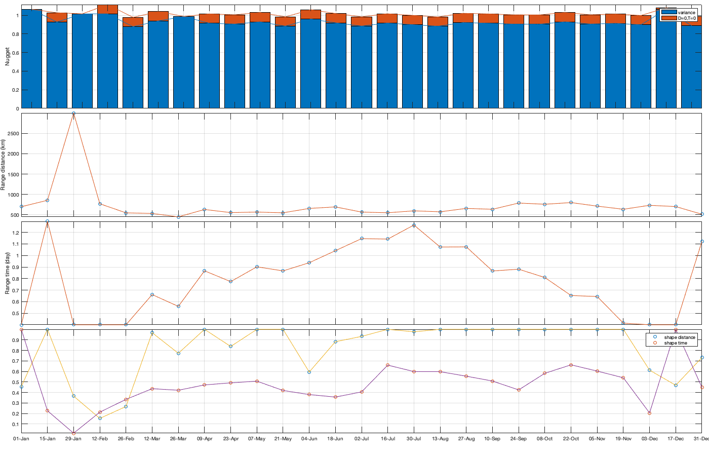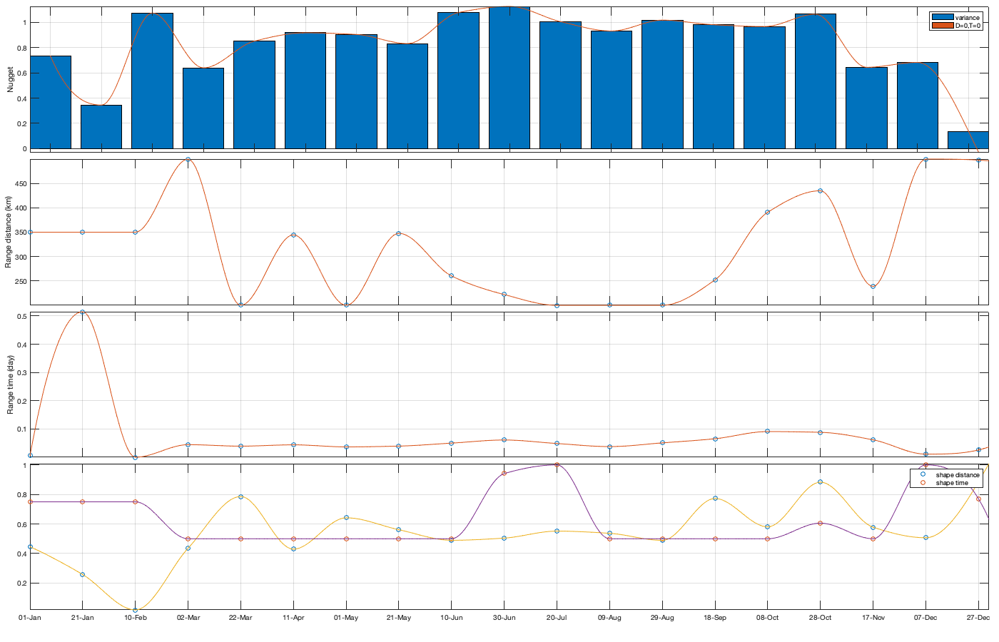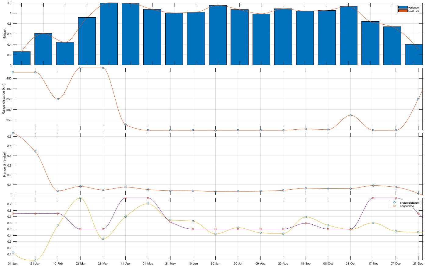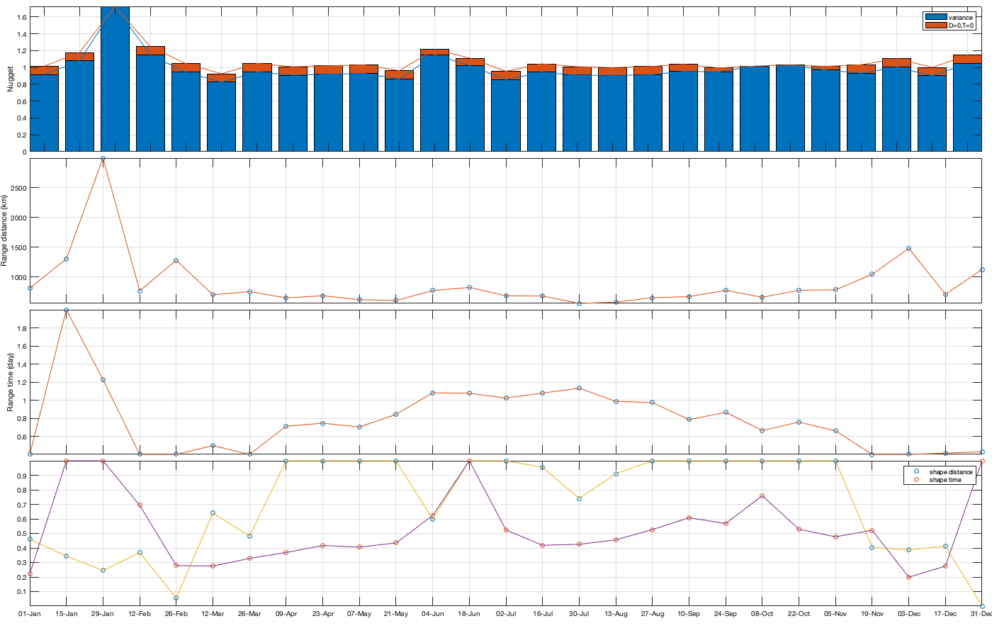 icov.Gneiting_time = @(time,range_time,delta) 1./( (time./range_time).^(2.*delta) +1 ); icov.Gneiting_dist = @(dist,range_dist,gamma) exp(-(dist./range_dist).^(2.*gamma) ); icov.Gneiting_fx = @(D,T,parm) parm(1)*(D==0 & T==0) + parm(2).*icov.Gneiting_dist(D,parm(3),parm(6)).*icov.Gneiting_time(T,parm(4),parm(5)); parm0 =[.1 .6 50 .05 1 0]; Aeq=[1 1 0 0 0 0]; parm_min=[0 0 200 0 0 0.5]'; for i_uv =1:numel(uv) icov.(['parm_' uv{i_uv}]) = nan(numel(parm0),numel(icov.m)); for i_m=1:numel(icov.m) if icov.n(1,1,i_m)>0 max_cov = icov.(['emp_grid_' uv{i_uv}])(1,1,i_m); parm_max=[0 max_cov 500 1 1 1]'; A = [1 0 0 0 0 0]; b = 0.1*(max_cov-max(icov.(['emp_grid_' uv{i_uv}])(1,2,i_m),icov.(['emp_grid_' uv{i_uv}])(2,1,i_m))); beq=max_cov; err1 = @(parm) icov.Gneiting_fx(icov.D_emp(:,:,i_m),icov.T_emp(:,:,i_m),parm) - icov.(['emp_grid_' uv{i_uv}])(:,:,i_m); err2 = @(parm) sum( 1000*max(icov.(['emp_grid_' uv{i_uv}])(:,:,i_m),0.01).*( err1(parm).^4 ) ,'all','omitnan'); rmse = @(parm) nansum(nansum( 1000*max(icov.(['emp_grid_' uv{i_uv}])(:,:,i_m),0.01).*( (icov.Gneiting_fx(icov.D_emp(:,:,i_m),icov.T_emp(:,:,i_m),parm) - icov.(['emp_grid_' uv{i_uv}])(:,:,i_m)).^4 ) )); icov.(['parm_' uv{i_uv}])(:,i_m) = fmincon(err2, parm0, A, b, Aeq, beq, parm_min, parm_max, [], optimoptions('fmincon','Display','off')); parm0 = icov.(['parm_' uv{i_uv}])(:,i_m); end end tmp = [icov.(['parm_' uv{i_uv}])(:,end-4:end) icov.(['parm_' uv{i_uv}]) icov.(['parm_' uv{i_uv}])(:,1:5)]; icov_m = icov.m; icov_parm = tmp(:,6:end-5); icov.(['f_parm_' uv{i_uv}]) = @(x) [... interp1(icov_m, icov_parm(1,:), x, 'pchip') ;... interp1(icov_m, icov_parm(2,:), x, 'pchip') ;... interp1(icov_m, icov_parm(3,:), x, 'pchip') ;... interp1(icov_m, icov_parm(4,:), x, 'pchip') ;... interp1(icov_m, icov_parm(5,:), x, 'pchip') ;... interp1(icov_m, icov_parm(6,:), x, 'pchip') ]; end % Display parameters of covariance % fprintf(['nugget(0,0)\t nugget(0,:)\t var\t range distance[km]\t range time[day]\t shape distance (delta)\t shape time (gamma)\t separability (beta)\n%.3f\t\t %.3f\t\t %.3f\t %.3f\t\t %.3f\t\t\t %.3f\t\t\t %.3f\t\t\t %.3f\n%.3f\t\t %.3f\t\t %.3f\t %.3f\t\t %.3f\t\t\t %.3f\t\t\t %.3f\t\t\t %.3f\n%.3f\t\t %.3f\t\t %.3f\t %.3f\t\t %.3f\t\t\t %.3f\t\t\t %.3f\t\t\t %.3f\n%.3f\t\t %.3f\t\t %.3f\t %.3f\t\t %.3f\t\t\t %.3f\t\t\t %.3f\t\t\t %.3f'],icov.parm) if plotit % Illustration of the fitted covariance function [tmpD,tmpT] = meshgrid(icov.d(1):1:icov.d(end),icov.t(1):0.01:icov.t(end)); for i_uv =1:numel(uv) figure('position',[0 0 1600 900]); tiledlayout('flow','TileSpacing','tight','Padding','tight') for i_m=1:numel(icov.m) nexttile; hold on; title(datestr(datetime(1,1,icov.m(i_m)),'dd-mmm')); s=surf(tmpD,tmpT,icov.Gneiting_fx(tmpD, tmpT,icov.(['f_parm_' uv{i_uv}])(icov.m(i_m)))); s.EdgeColor='none'; % surf(cov.D_emp(:,:,i_m),cov.T_emp(:,:,i_m),cov.emp_grid(:,:,i_m)); scatter3(reshape(icov.D_emp(:,:,i_m),1,[]),reshape(icov.T_emp(:,:,i_m),1,[]),reshape(icov.(['emp_grid_' uv{i_uv}])(:,:,i_m),1,[]),[],reshape(icov.(['emp_grid_' uv{i_uv}])(:,:,i_m),1,[]),'filled','MarkerEdgeColor','k'); %xlabel('Distance [km]'); ylabel('Time [days]'); view(3); plot3([0 0],[0 0],[icov.(['parm_' uv{i_uv}])(2,i_m) sum(icov.(['parm_' uv{i_uv}])(1:2,i_m))],'r', 'linewidth',2) end end for i_uv =1:numel(uv) tmp_parm = icov.(['f_parm_' uv{i_uv}])(1:365); col=colororder; figure('position',[0 0 1400 900]); ha = tight_subplot(4,1,.01,[.05 .01],[.03 .01]); axes(ha(1)); bar(icov.m,flipud(icov.(['parm_' uv{i_uv}])(1:2,:))','stack'); hold on; plot(tmp_parm(2,:),'color',col(1,:)); plot(sum(tmp_parm(1:2,:)),'color',col(2,:)); ylabel('Nugget'); legend('variance','D=0,T=0'); grid on; axis tight; xticks(icov.m); xticklabels(''); axes(ha(2)); plot(icov.m,icov.(['parm_' uv{i_uv}])(3,:),'o'); hold on; plot(tmp_parm(3,:)) ylabel('Range distance (km)'); axis tight; grid on; xticks(icov.m); xticklabels(''); axes(ha(3)); plot(icov.m,icov.(['parm_' uv{i_uv}])(4,:),'o'); hold on; plot(tmp_parm(4,:)) ylabel('Range time (day)'); axis tight; grid on; xticks(icov.m); xticklabels(''); axes(ha(4)); plot(icov.m,icov.(['parm_' uv{i_uv}])(5:6,:)','o'); hold on; plot(tmp_parm(5:6,:)') legend('shape distance','shape time'); grid on; axis tight;xticks(icov.m); xticklabels(''); xticklabels(datestr(datetime(1,1,icov.m),'dd-mmm')) end end