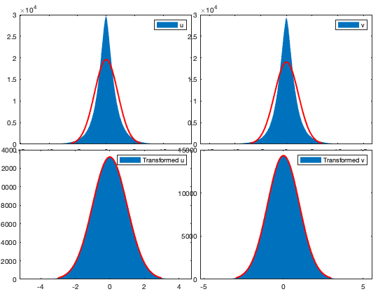 % Anamorphosis for intra for i_uv=1:numel(uv) [f,x] = ecdf(vici.(uv{i_uv})(:)); transi.([uv{i_uv} '_axis']) = x(2:(numel(x)/10000):end); transi.([uv{i_uv} '_axis_t']) = norminv(f(2:(numel(x)/10000):end)); victi.(uv{i_uv}) = interp1(transi.([uv{i_uv} '_axis']),transi.([uv{i_uv} '_axis_t']),vici.(uv{i_uv}),'pchip'); end figure; ha=tight_subplot(2,2); axes(ha(1)); histfit(vici.(uv{1})(:)); legend('u') axes(ha(2)); histfit(vici.(uv{2})(:)); legend('v') axes(ha(3)); histfit(victi.(uv{1})(:)); legend('Transformed u') axes(ha(4)); histfit(victi.(uv{2})(:)); legend('Transformed v')